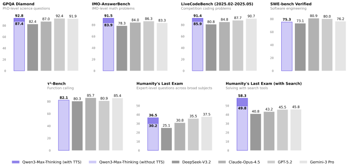 基于这一推理技术创新,千问推理性能和推理效率大为提升,比如在启用工具的“人类最后的测试”HLE中,千问得分58.3,大幅超过GPT-5.2-Thinking的45.5、Gemini3Pro的45.8,录得当前所有模型的最高分。
