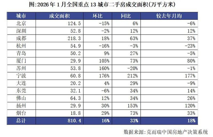 克而瑞数据监测自大,1月,寰宇要点13城市二手房成交面积约810万平淡米,环比上升16%,同比增长33%,比较上年月均增18%。其中,成都二手房成交面积达218万平淡米高踞首位,环比增长18%,同比激增63%,相较客岁月均增长37%;其次是北京,成交面积约125万平淡米,环比下降15%,同比仍握沉着增6%,相较客岁月均下降6%。