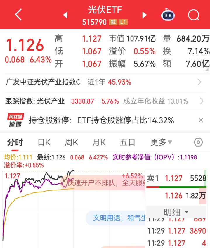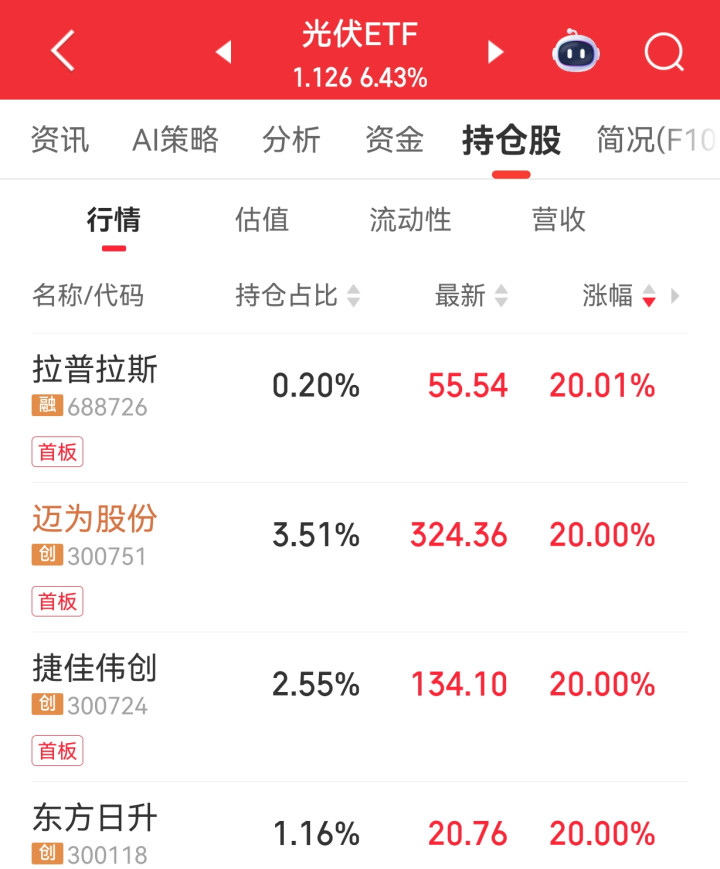 消息一经披露,A股光伏板块即刻迎来强势拉升,光伏龙头ETF1月23日上午大涨超6%,迈为股份、东方日升等企业斩获20cm涨停。