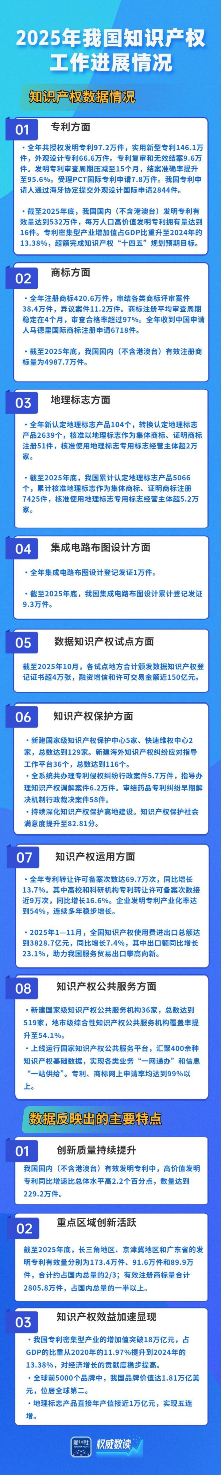 发明专利有效量达532万件,人工智能专利有效量居全球前列,地理标志产品直接年产值实现五连增……在23日国新办新闻发布会上,米兰app官网国家知识产权局介绍2025年我国知识产权工作进展情况。跟随海报,一起来看看吧。