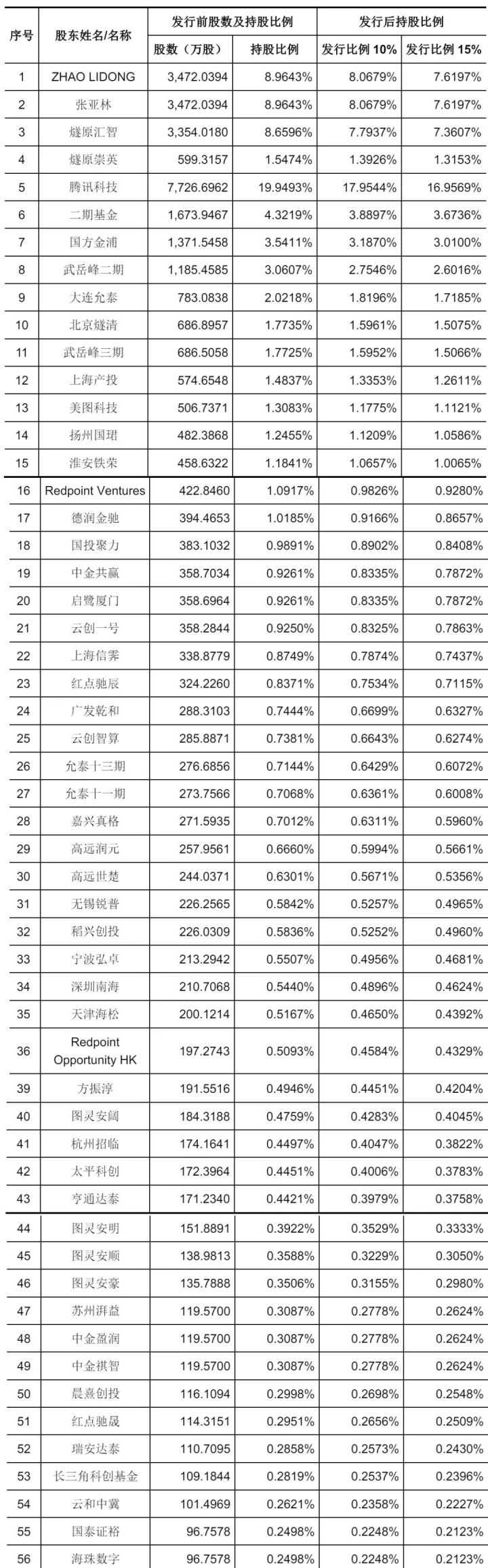 IPO后,ZHAO LIDONG、张亚林分别持股为7.6197%,燧原汇智持股为7.3607%,燧原崇英持股为1.3153%,腾讯科技持股为16.9569%,二期基金持股为3.6736%,国方金浦持股为3.01%,武岳峰二期持股为2.6016%,大连允泰持股为1.7185%,北京燧清持股为1.5075%,武岳峰三期持股为1.5066%;