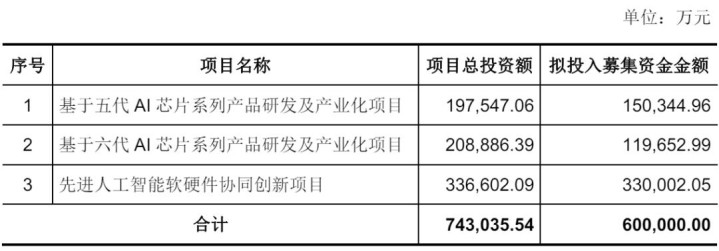 燧原科技计划募资60亿元,其中,15亿元用于基于五代 AI 芯片系列产品研发及产业化项目,11.97亿元用于基于六代 AI 芯片系列产品研发及产业化项目,33亿元用于先进人工智能软硬件协同创新项目。