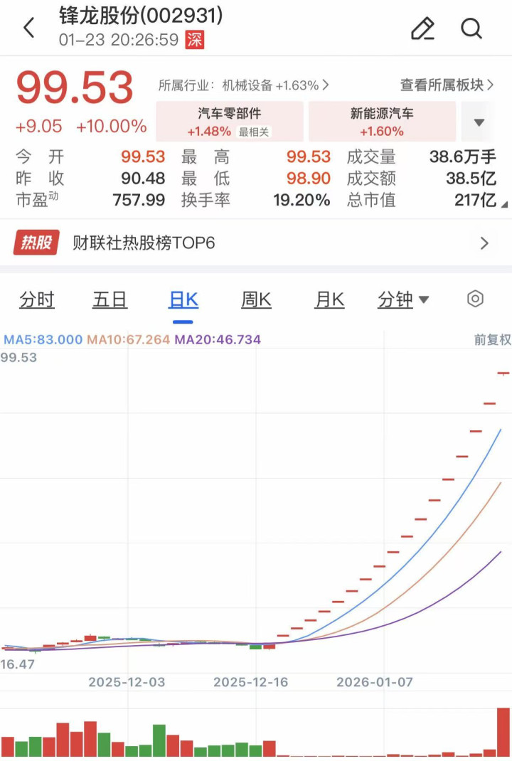 锋龙股份股价自去年12月17日启动以来,近一个月股价持续涨停。截至今日收盘,公司股价再度涨停,米兰app斩获18连板,股价报收99.53元/股,总市值飙升至217.5亿元。值得注意的是,在这波上涨行情中,锋龙股份曾于1月13日宣布停牌核查,但复牌后股价仍持续涨停。