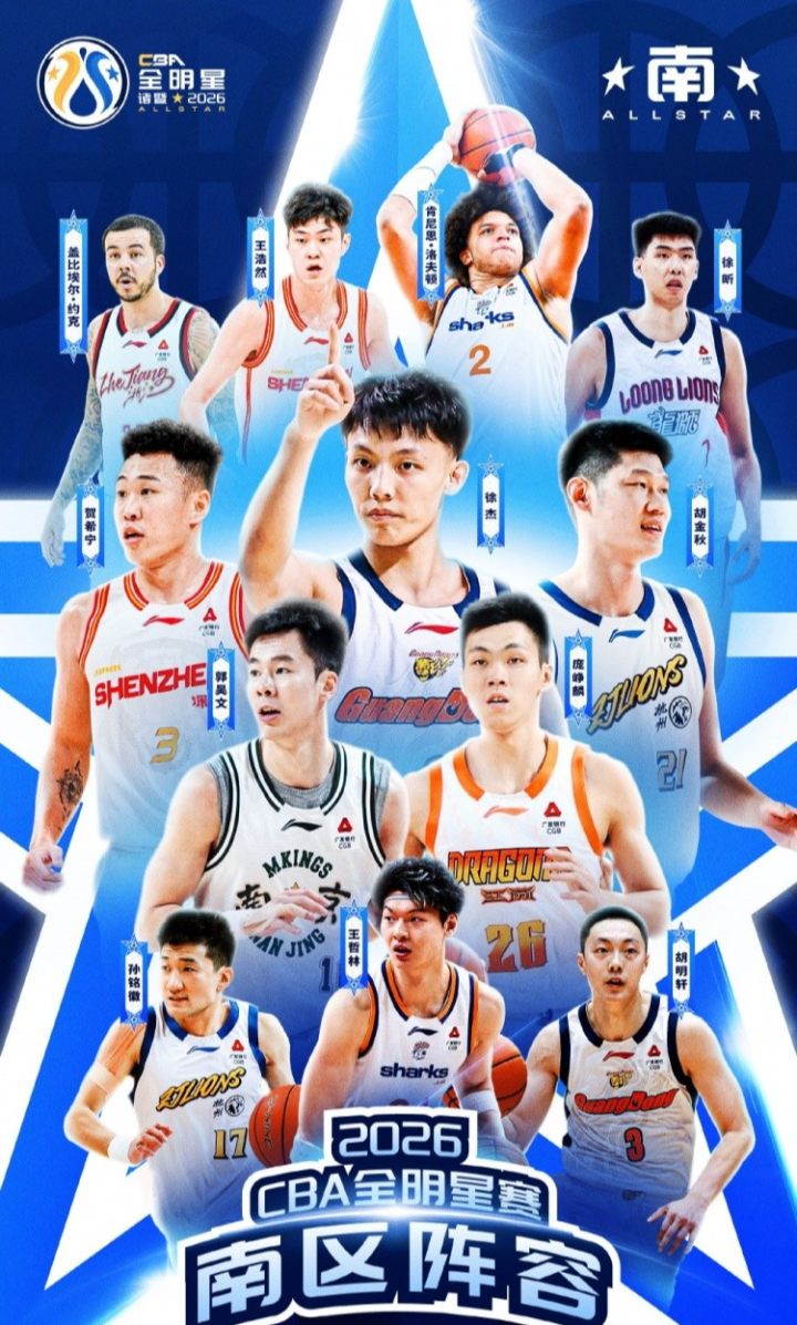 南区完整阵容,首发球员:深圳男篮贺希宁,浙江广厦男篮胡金秋,南京同曦男篮郭昊文,广东男篮徐杰 ,江苏肯帝亚男篮庞峥麟。新秀入选全明星首发,庞峥麟也算是独一份了。