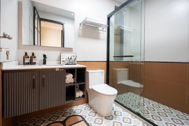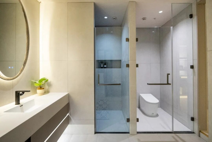 悬浮式贪图已成为主流。离地20-30公分,不仅视觉狭窄,便于清洁,下方还能舍弃体重秤或拖鞋篮。
