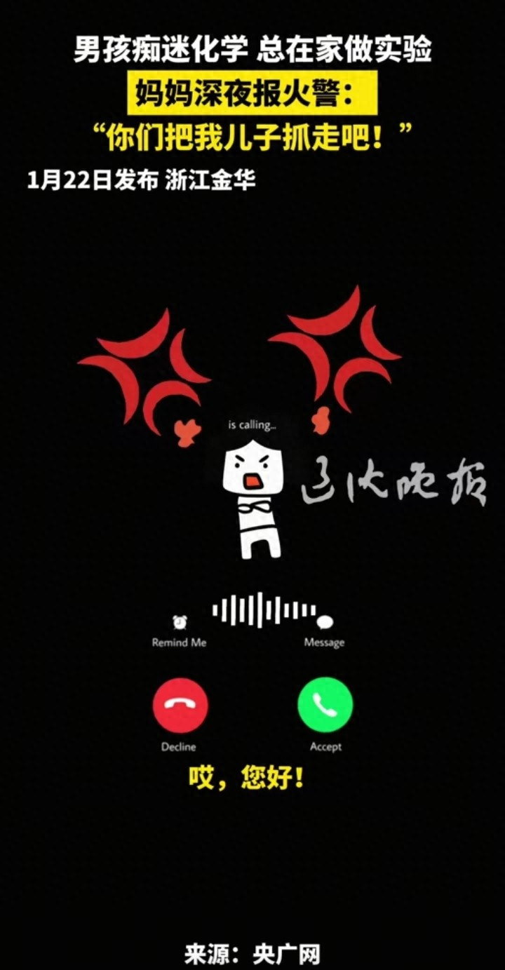 1月22日,金华市武义县。武义县消防救援大队接到一通特殊的报警电话。孩子妈妈称,自家13岁儿子痴迷化学实验,经常在住在套房里进行点火操作,多次劝阻无果后选择拨打119。