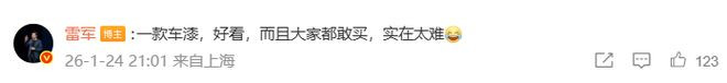 电动知家消息,1月24日晚,小米创始人雷军在社交媒体发文感叹:“熔岩橙,很帅!但是敢买的人太少了。”同时他宣布,小米SU7和YU7全系下架熔岩橙配色。他还连发三个泪目表情,言语间透露出对这款精心设计车漆的不舍与无奈。雷军在评论区进一步解释:“一款车漆,好看而且大家都敢买,实在太难。”此时距离小米SU7首次亮相不足两年,熔岩橙曾被誉为“有品位、足够自信的人才能驾驭”的配色。