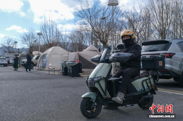 1月25日,拉萨市中华文化公园内,一位户外露营爱好者准备出发去接单送外卖,该营地不少人兼职当外卖员,以支撑自己的户外生活。江飞波摄