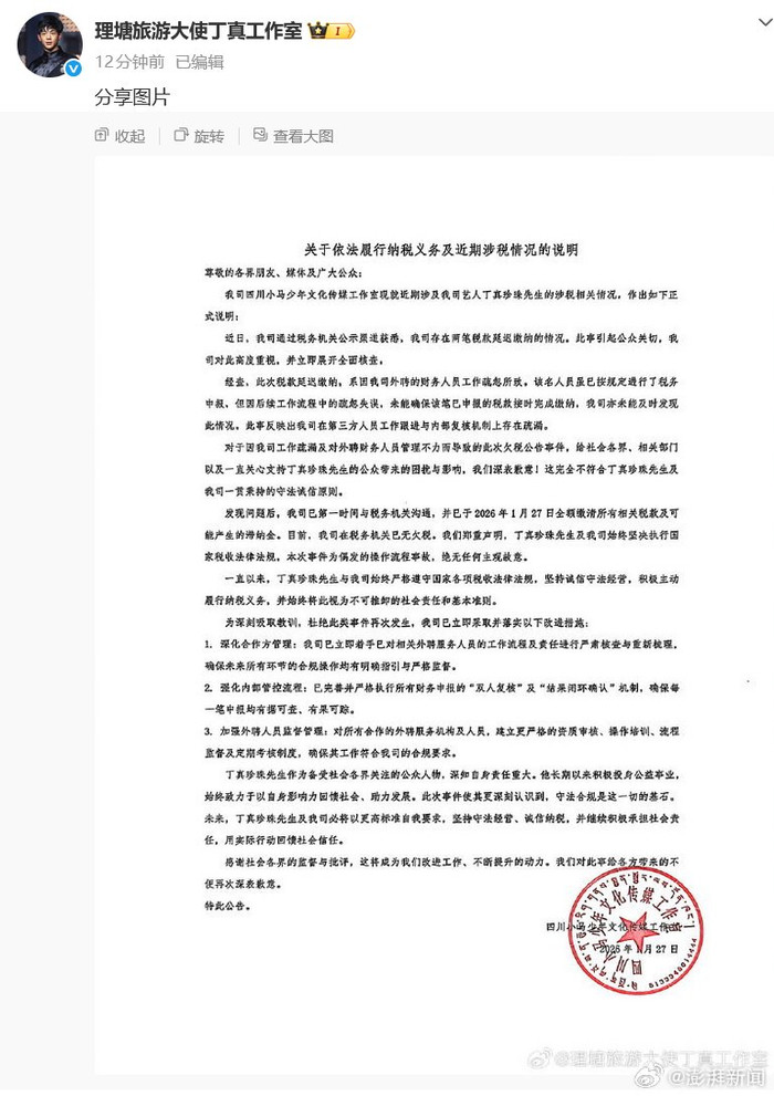 #丁真工作室回应欠税公告#[#丁真工作室称延迟缴税系外聘财务疏忽#]1月27日,@理塘旅游大使丁真工作室发文回应涉税情况,称出现的税款延迟缴纳,是由外聘的财务人员疏忽导致,米兰app官网版发现问题后已经与税务机关沟通,并在今天全额缴清税款及滞纳金。工作室称本事件为偶发操作事故,绝无任何主观故意。